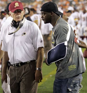 Clinton Portis wore a sling after dislocating his shoulder in Washington'south first preseason game in 2006, an injury that forced him to miss the first one-half of the season.